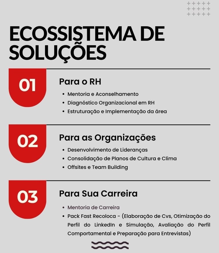 Nossos métodos são sempre voltados a partir da real necessidade do business e de seus profissionais, capturando a essência e a cultura dos nossos clientes, alinhavando o propósito da organização com a estratégia de pessoas, gerando assim um impacto de resoluções esperadas. Para isso contamos com um mapa de soluções, altamente customizadas para cada tipo de realidade.